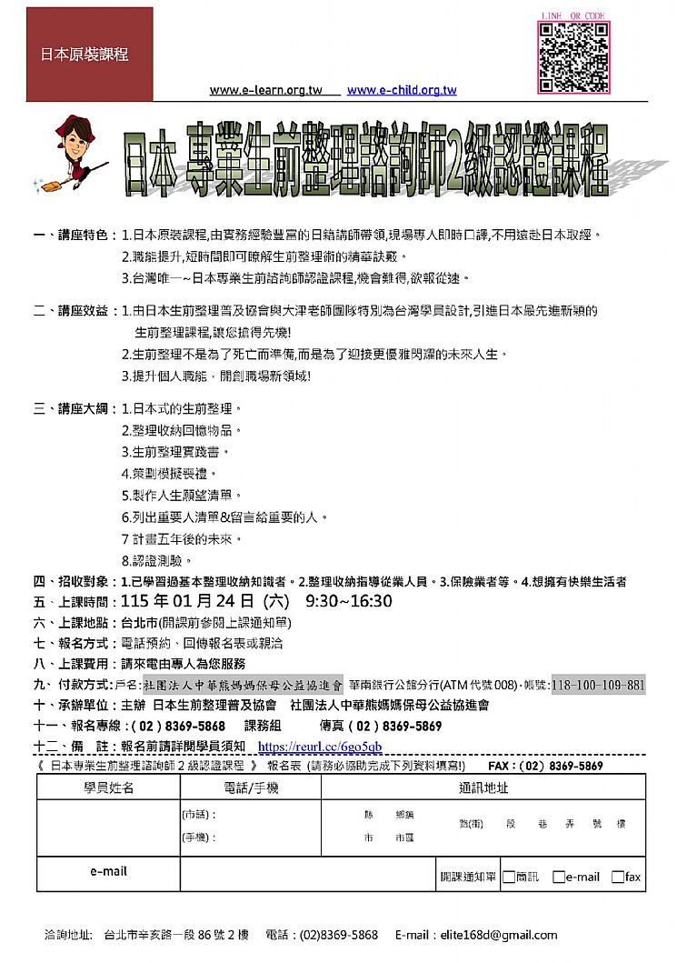 【台北市】115.01.24日本專業生前整理諮詢師2級認證課程