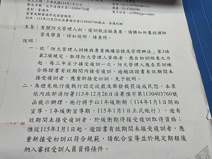 115年1月1日起防火管理人/保安監督人/保安檢查員合格證書逾有效期間必須重新上初訓