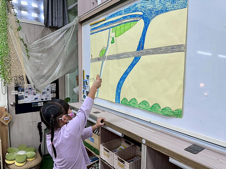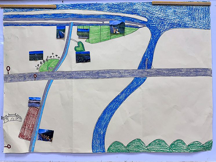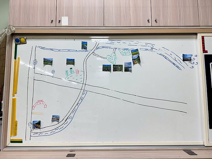 透過全貌地看見,孩子們看見清水濕地全觀的美,也建構著相對方位概念,我們將延伸帶孩子看見田與河水的關係,隨著候鳥棲息的冬季來到,孩子也發現著田裡成群候鳥的棲息,也成為後續延伸地探究……