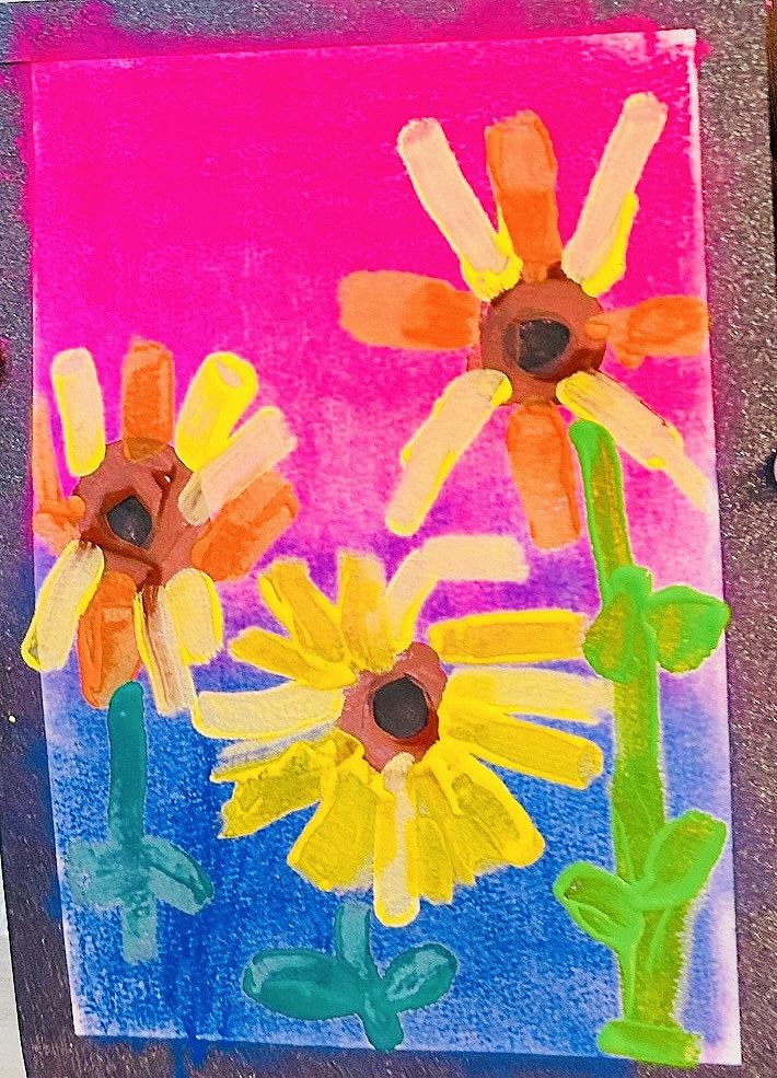 用紙膠帶將粗紋水彩紙做成畫框,運用粉彩在水彩紙上擦拭出暈染的紋理效果,接著將黃色系列顏料,堆疊出深淺不同層次的向日葵花朵;之後會用乾刷方式來呈現紙張紋路的層次感,並用黏土及自然素材(稻穗、蓮梗、蓮蓬)創作出向日葵,使得每朵向日葵猶如綻放花朵的生動。