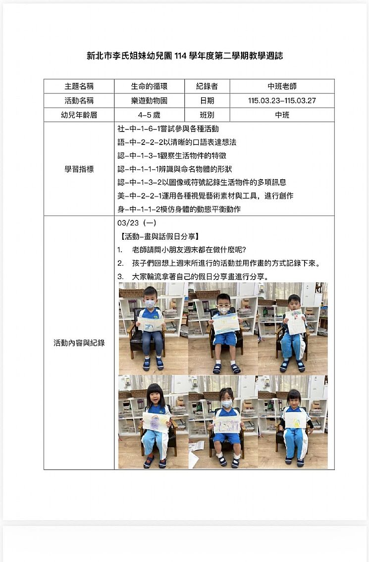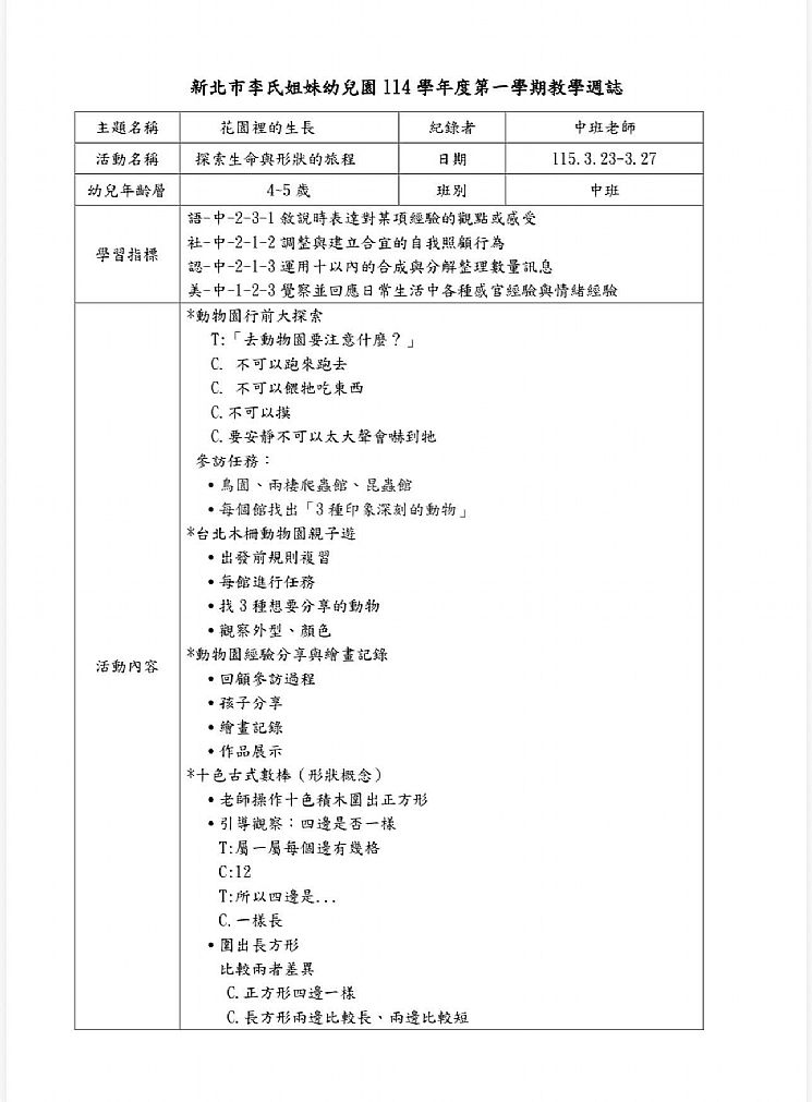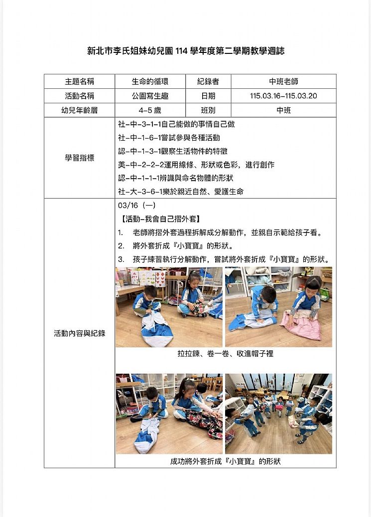 關於【 #週教案 #中班 #115年3月16號至115年3月27號 】留下您的留言