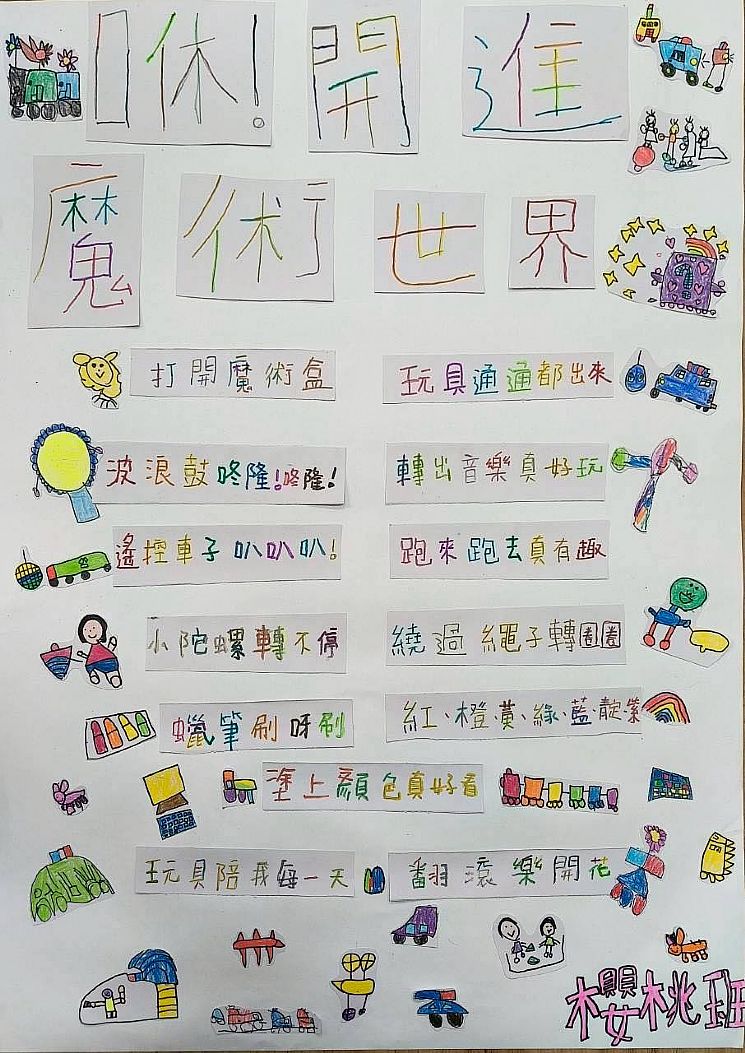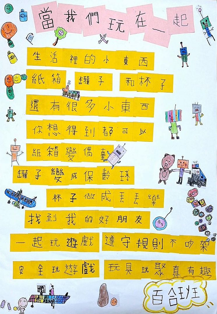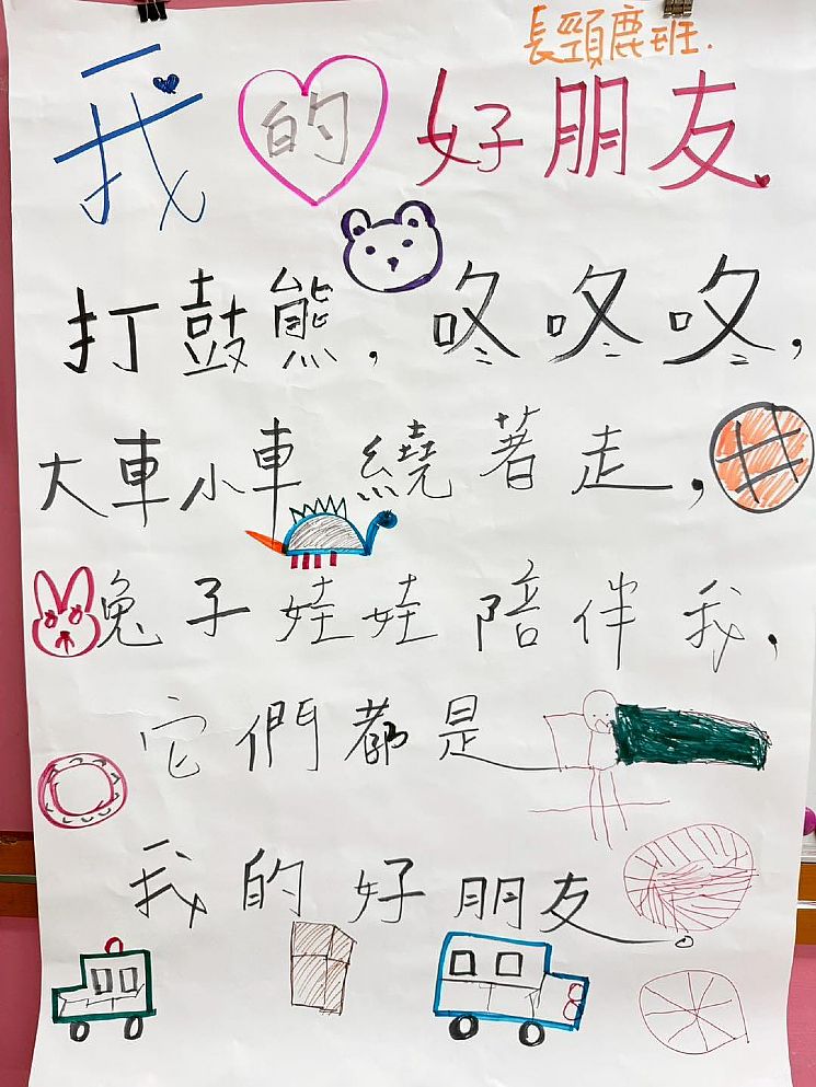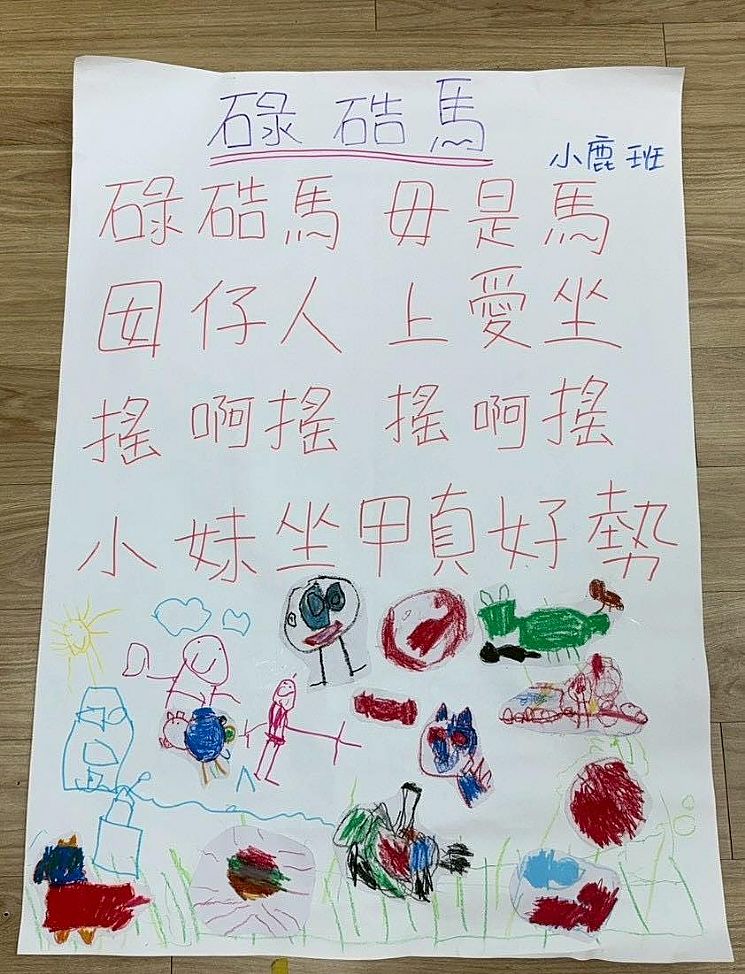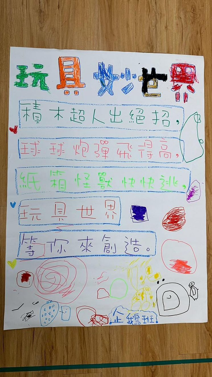 中大班的孩子更進一步,不僅親自書寫海報文字、參與設計與創作,還與同儕合作構思與完成演說內容,在過程中展現出團隊合作與語文表達的能力。