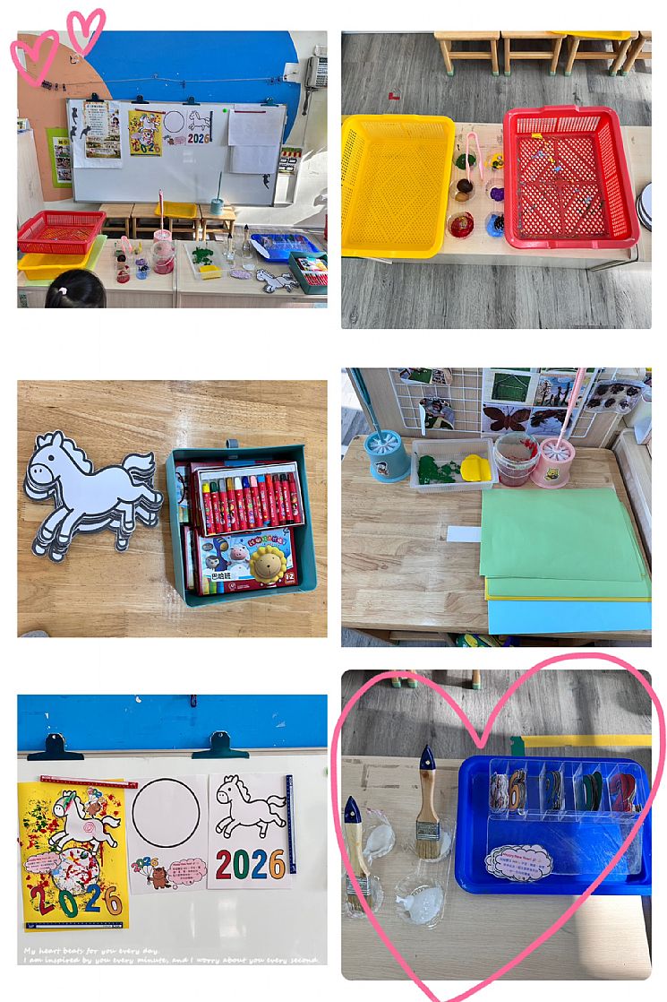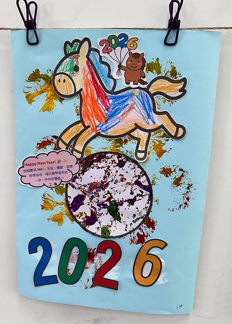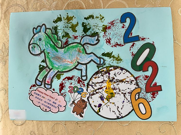 最後貼上 「2026」字體 與 新年祈福卡,讓作品不只是完成一幅畫,更承載著孩子對新年的期待與祝福。
