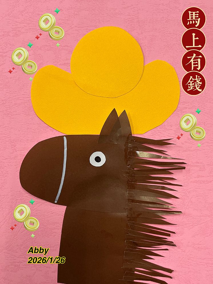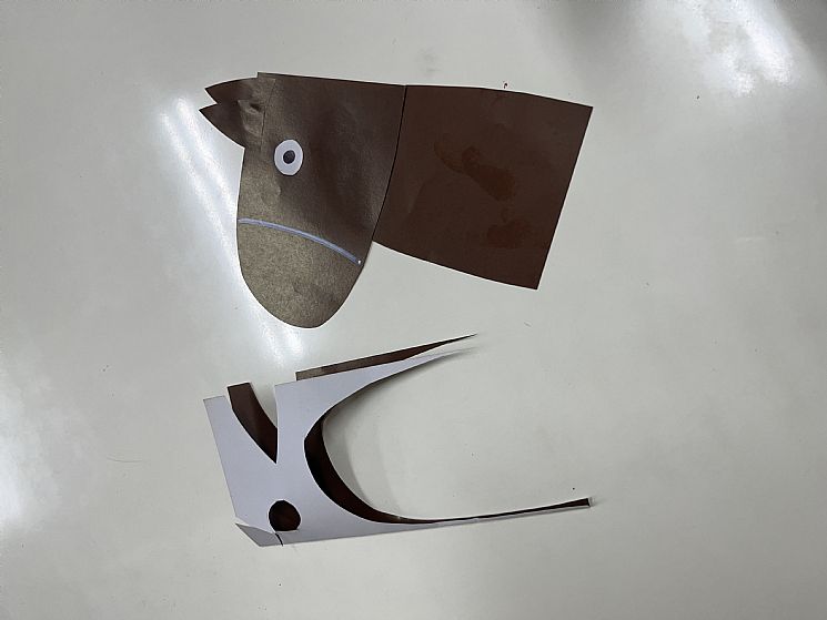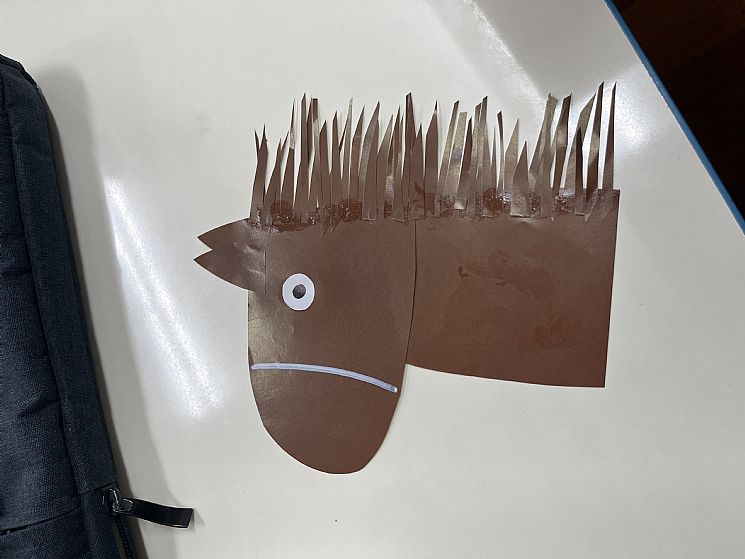 發下畫好的模板讓孩子練習剪下並組裝,孩子發現動物五官位置與人類不同,所以再黏貼耳朵時也會重複對應馬的圖片,希望能貼在對的位置上。剩下的紙張煎長條型貼出鬃毛!