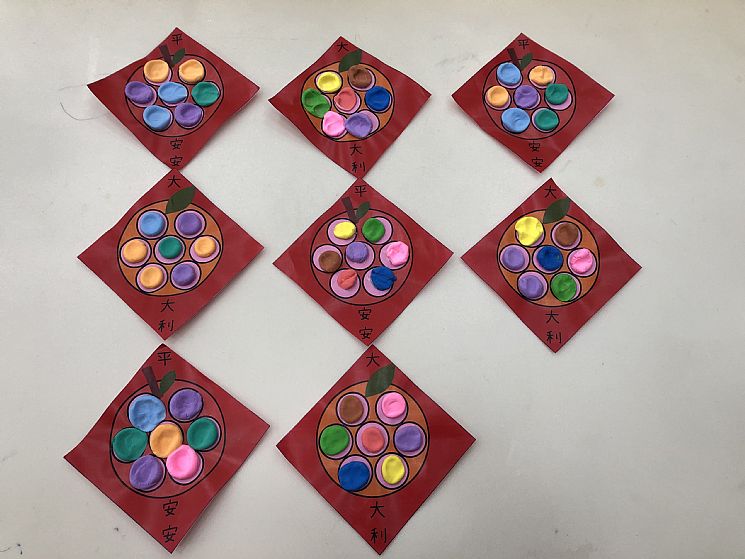 做法:把印好的蘋果或是橘子的圖用彩色的圖案列印出來後,再讓小朋友用各色的黏土搓成小圓後,塗上白膠,再黏貼在圖案上最後再用大姆指再黏土上壓扁這樣就完成黏土春聯了。