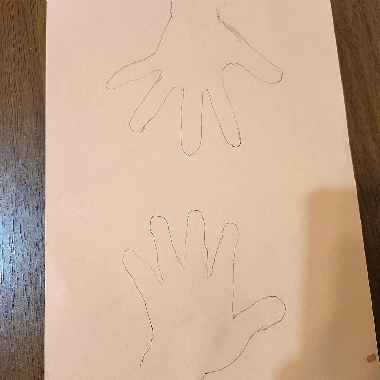 畫出小孩子們的手在剪下來貼在另一張紙上,畫出經脈在讓孩子們用手指沾顏料點上,做出自己的風格畫