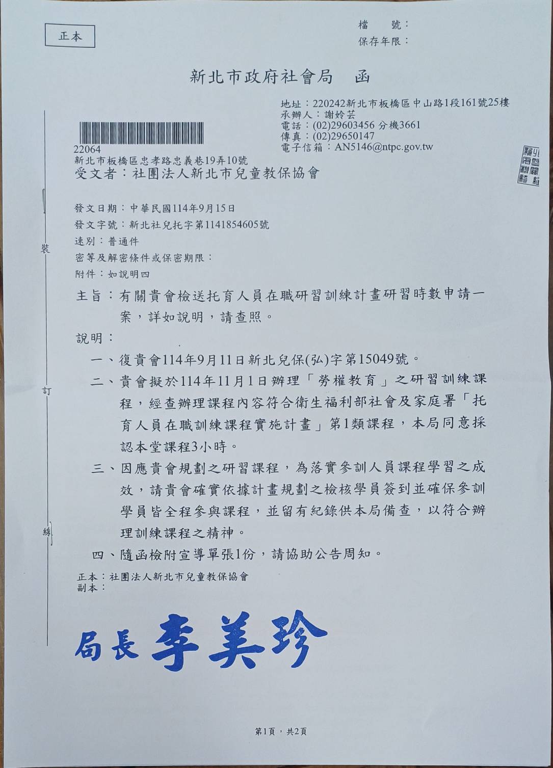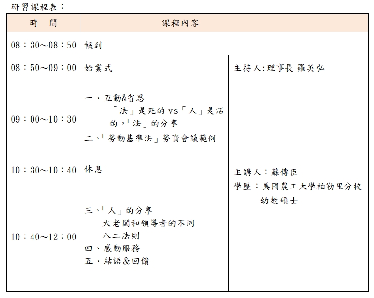 研習時數 | 全程參與者由新北市政府教育局/社會局核發「勞權教育」時數3小時。 | ||