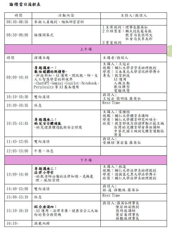 隨著幼兒教育環境快速變遷,教保服務人員除了需具備紮實的教學專業外,更需具備人工智慧AI科技應用、幼兒健康體適能促進,以及日益重要的法律素養與危機處理能力。本論壇透過跨領域專題分享與交流,協助教保人員在實務中持續精進,並建立支持性的專業社群。
