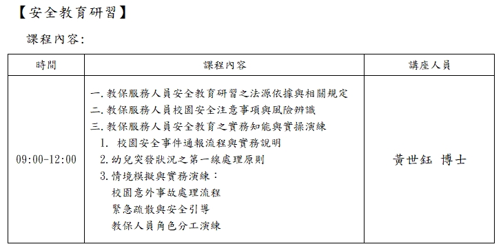 (三) 促進教保服務人員、同儕之間的安全協作,確保兒童在園安全與健康。 講師:黃世鈺 博士 現職 高科大博士班特聘指導教授 教育部大學教師教學研究計畫審委 行政院公程會審委